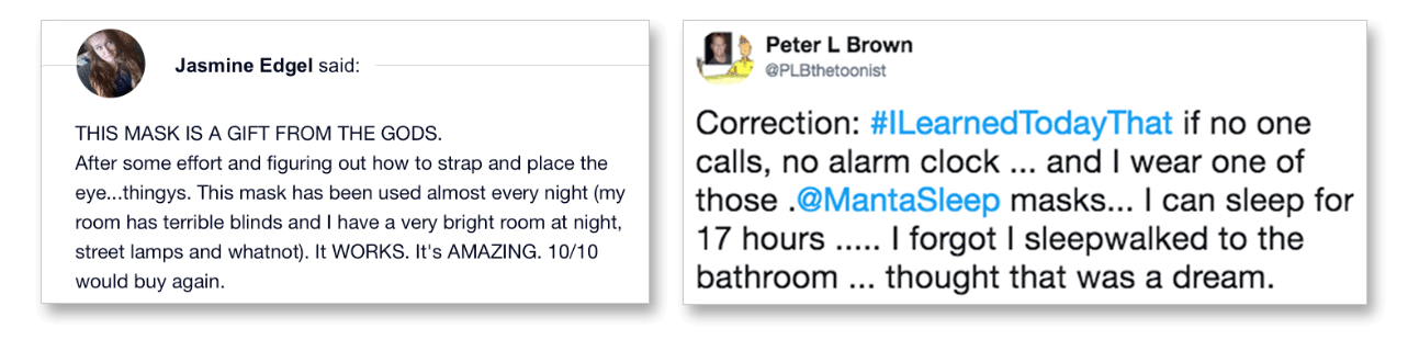 "I've owned many sleeping masks, and honestly, all of them combined could never be as good as the Manta! It's so amazingly comfortable and works better than expected. Thank you for creating such a great product!" - Mako
